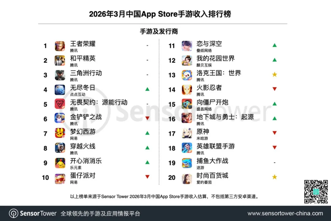 聚焦中国App Store市场,腾讯系产品展现出了强大的统治力。《王者荣耀》《和平精英》《三角洲行动》强势包揽3月手游收入榜前三甲。