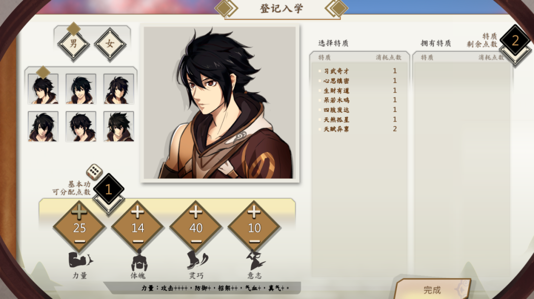 游戏开局时,玩家可以从6个初始特质中选取一个,以及在“力量”、“体魄”、“灵巧”、“意志”中分配50点属性值。与前作《侠客风云传》以及《河洛群侠传》的开局相比,本作让玩家纠结的点少了许多,只有在后续武学修炼、支线选择上才凸显开局属性的差异。
