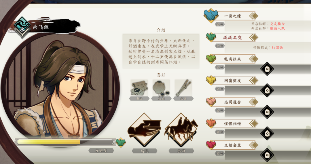 交友系统是本作是另一大亮点,在测试版中,共有五位好友可以结交,玩家可以通过剧情的选项或者在养成模式中送礼提升好感度。好感度满了后,则可以通过“出行”选项解锁友好事件,随着好感度的提升,好友也将解锁更多的武学及特质,这将直接影响游戏的后续内容。