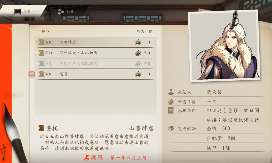 与《侠客风云传》相似的是,《侠隐阁》的游戏内容在学院养成以及主线剧情之间穿插进行,分歧点在于在《侠客风云传》中,如果玩家不看攻略,只能通过“闲逛”功能随机触发支线剧情,而在《侠隐阁》中,支线剧情可以直接在“传书”功能找到,只要角色满足相应的属性需求,即可触发支线。