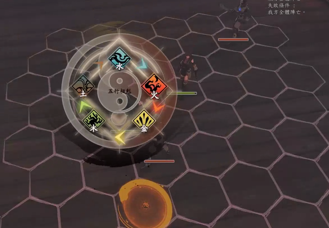 进入游戏后,会进行简单的教学,游戏战斗仍采取传统的六边形战棋式玩法,与前作不同的是,本作加入了五行相克系统,每个角色都有各自的天生五行。而主角则天生有能自由转换五行的能力,在战斗过程中,可以通过转换克制敌方的五行造成更大伤害。这个设定也让玩家有了更多的思考空间,在多人战斗中,需要考虑在克制更多人的同时,使得自己也不受到五行的克制。